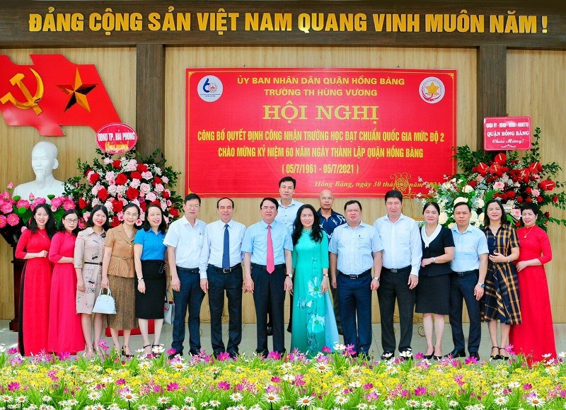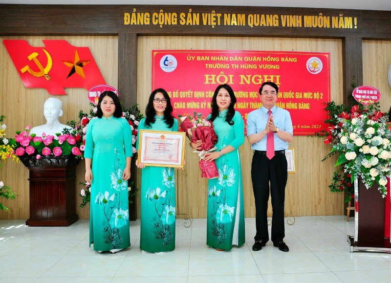 Ông Lê Khắc Nam- Phó chủ tịch UBND thành phố Hải Phòng trao Bằng công nhận trường đạt chuẩn QG mức độ 2 cho Trường tiểu học Hùng Vương.