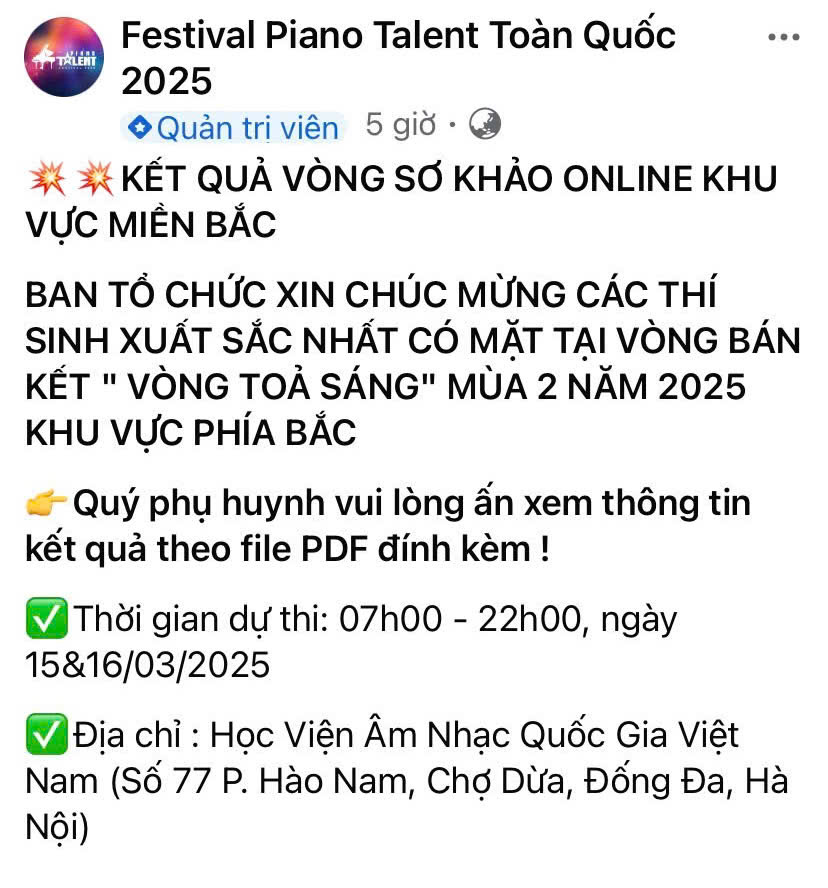 🎉Vòng 2 (vòng bán kết toàn quốc) sẽ diễn ra vào ngày 15/3/2025 tại phòng hoà nhạc (học viện Âm Nhạc Quốc Gia Việt Nam)