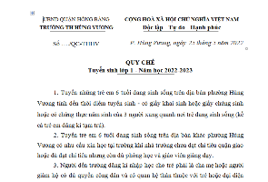1. Tuyển những trẻ em 6 tuổi đang sinh sống trên địa bàn phường Hùng Vương tính đến thời điểm tuyển sinh - có giấy khai sinh hoặc giấy chứng sinh hoặc có chứng thực năm sinh của 3 người xung quanh nơi trẻ đang sinh sống (kể cả trẻ em đăng kí tạm trú).